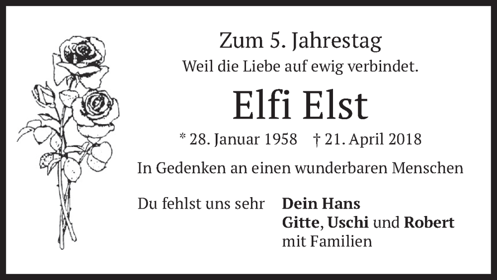 Hier finden Sie alle Traueranzeigen aus der Zeitung, die bisher für Elfi Elst erschienen sind. Weitere Traueranzeigen, die in der Zeitung erscheinen, werden hier ebenfalls aufgelistet