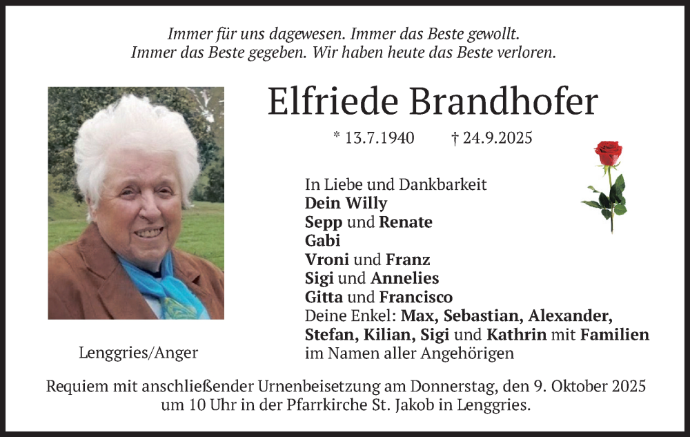 Hier finden Sie alle Traueranzeigen aus der Zeitung, die bisher für Elfriede Brandhofer erschienen sind. Weitere Traueranzeigen, die in der Zeitung erscheinen, werden hier ebenfalls aufgelistet