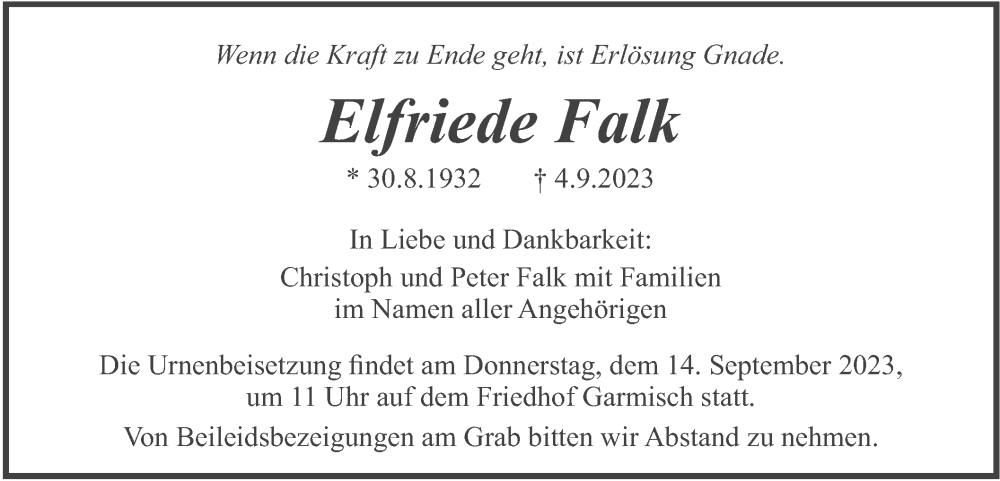 Hier finden Sie alle Traueranzeigen aus der Zeitung, die bisher für Elfriede Falk erschienen sind. Weitere Traueranzeigen, die in der Zeitung erscheinen, werden hier ebenfalls aufgelistet