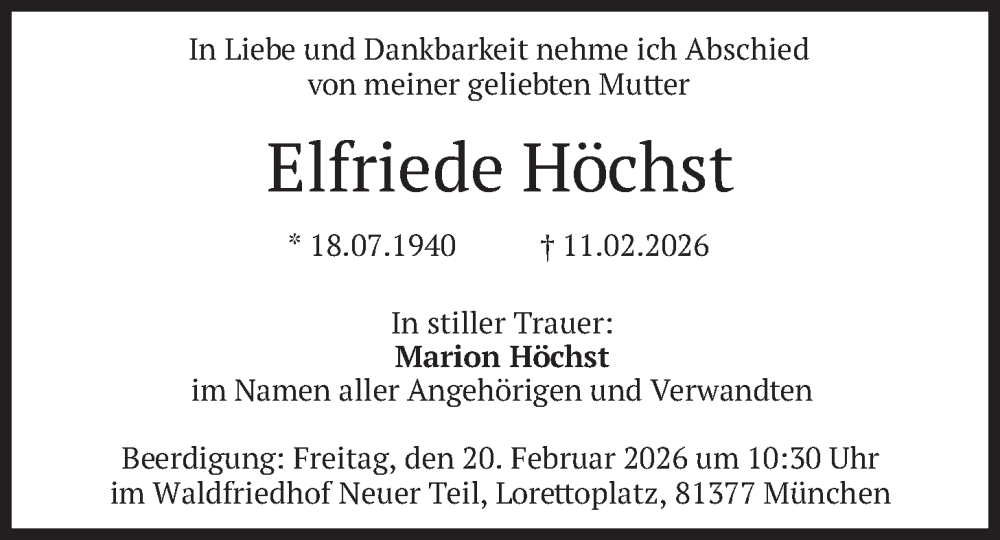 Hier finden Sie alle Traueranzeigen aus der Zeitung, die bisher für Elfriede Höchst erschienen sind. Weitere Traueranzeigen, die in der Zeitung erscheinen, werden hier ebenfalls aufgelistet