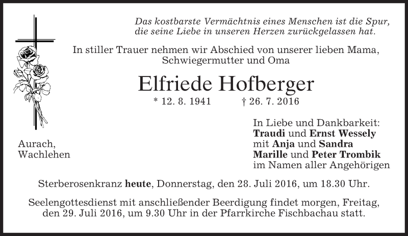 Hier finden Sie alle Traueranzeigen aus der Zeitung, die bisher für Elfriede Hofberger erschienen sind. Weitere Traueranzeigen, die in der Zeitung erscheinen, werden hier ebenfalls aufgelistet