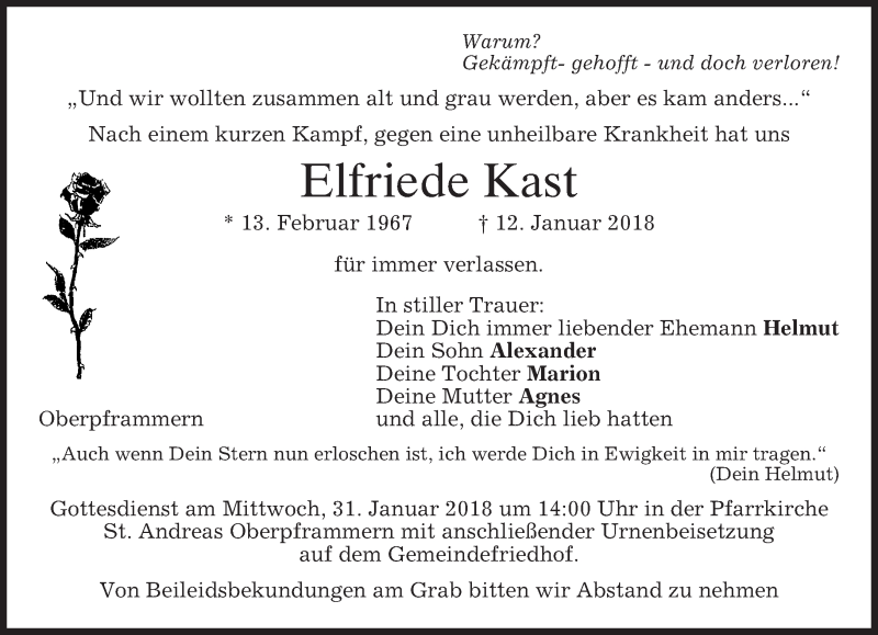 Hier finden Sie alle Traueranzeigen aus der Zeitung, die bisher für Elfriede Kast erschienen sind. Weitere Traueranzeigen, die in der Zeitung erscheinen, werden hier ebenfalls aufgelistet
