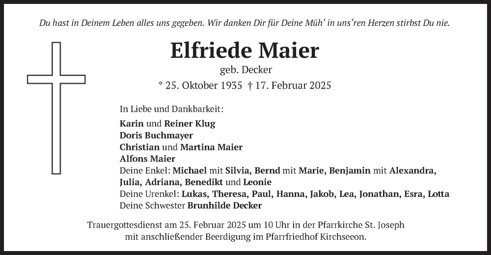 Hier finden Sie alle Traueranzeigen aus der Zeitung, die bisher für Elfriede Maier erschienen sind. Weitere Traueranzeigen, die in der Zeitung erscheinen, werden hier ebenfalls aufgelistet