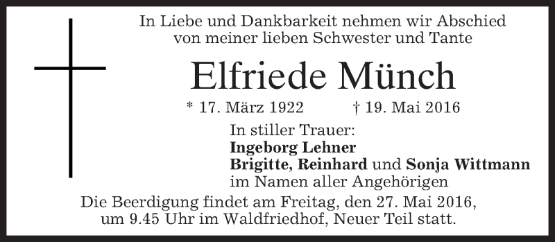 Hier finden Sie alle Traueranzeigen aus der Zeitung, die bisher für Elfriede Münch erschienen sind. Weitere Traueranzeigen, die in der Zeitung erscheinen, werden hier ebenfalls aufgelistet