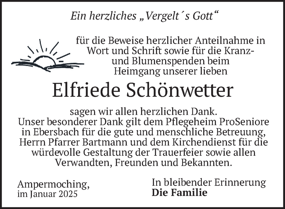 Hier finden Sie alle Traueranzeigen aus der Zeitung, die bisher für Elfriede Schönwetter erschienen sind. Weitere Traueranzeigen, die in der Zeitung erscheinen, werden hier ebenfalls aufgelistet