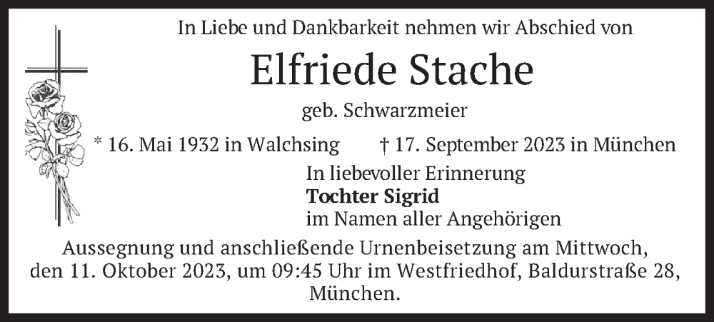 Hier finden Sie alle Traueranzeigen aus der Zeitung, die bisher für Elfriede Stache erschienen sind. Weitere Traueranzeigen, die in der Zeitung erscheinen, werden hier ebenfalls aufgelistet