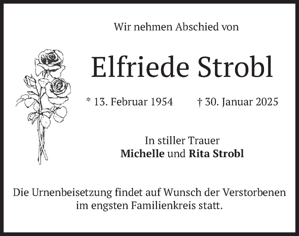 Hier finden Sie alle Traueranzeigen aus der Zeitung, die bisher für Elfriede Strobl erschienen sind. Weitere Traueranzeigen, die in der Zeitung erscheinen, werden hier ebenfalls aufgelistet