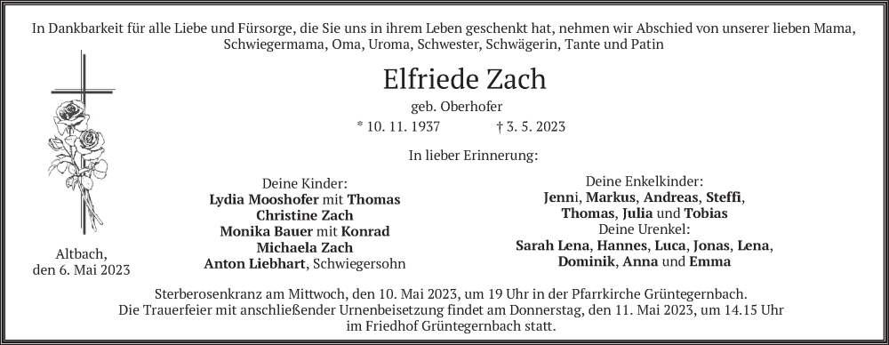 Hier finden Sie alle Traueranzeigen aus der Zeitung, die bisher für Elfriede Zach erschienen sind. Weitere Traueranzeigen, die in der Zeitung erscheinen, werden hier ebenfalls aufgelistet