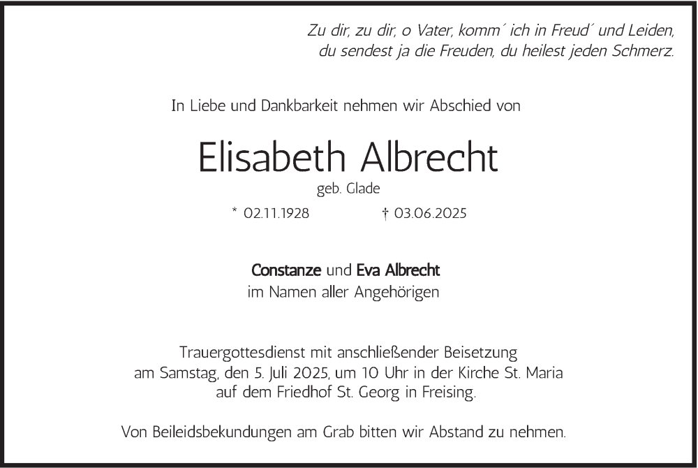 Hier finden Sie alle Traueranzeigen aus der Zeitung, die bisher für Elisabeth Albrecht erschienen sind. Weitere Traueranzeigen, die in der Zeitung erscheinen, werden hier ebenfalls aufgelistet