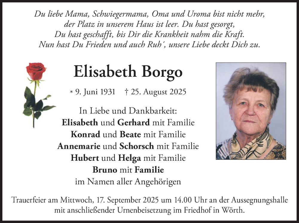 Hier finden Sie alle Traueranzeigen aus der Zeitung, die bisher für Elisabeth Borgo erschienen sind. Weitere Traueranzeigen, die in der Zeitung erscheinen, werden hier ebenfalls aufgelistet