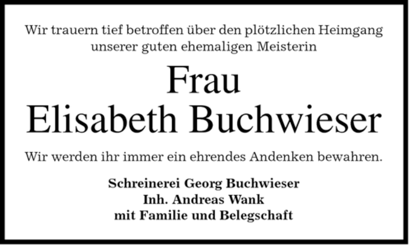 Hier finden Sie alle Traueranzeigen aus der Zeitung, die bisher für Elisabeth Buchwieser erschienen sind. Weitere Traueranzeigen, die in der Zeitung erscheinen, werden hier ebenfalls aufgelistet