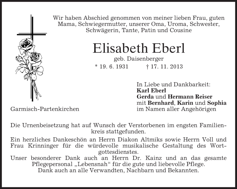 Hier finden Sie alle Traueranzeigen aus der Zeitung, die bisher für Elisabeth Eberl erschienen sind. Weitere Traueranzeigen, die in der Zeitung erscheinen, werden hier ebenfalls aufgelistet