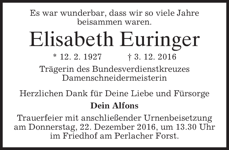 Hier finden Sie alle Traueranzeigen aus der Zeitung, die bisher für Elisabeth Euringer erschienen sind. Weitere Traueranzeigen, die in der Zeitung erscheinen, werden hier ebenfalls aufgelistet