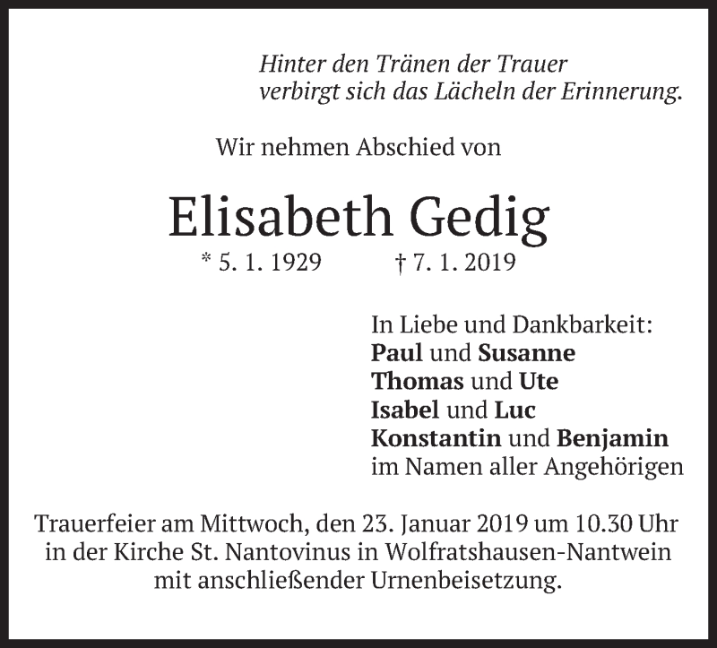 Hier finden Sie alle Traueranzeigen aus der Zeitung, die bisher für Elisabeth Gedig erschienen sind. Weitere Traueranzeigen, die in der Zeitung erscheinen, werden hier ebenfalls aufgelistet
