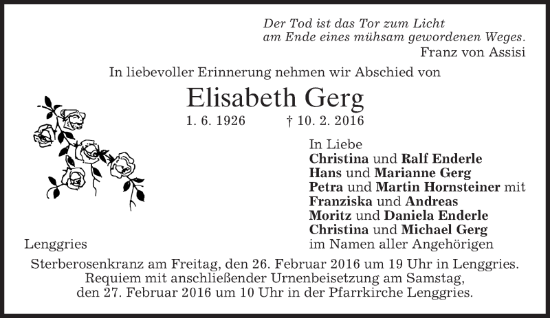 Hier finden Sie alle Traueranzeigen aus der Zeitung, die bisher für Elisabeth Gerg erschienen sind. Weitere Traueranzeigen, die in der Zeitung erscheinen, werden hier ebenfalls aufgelistet