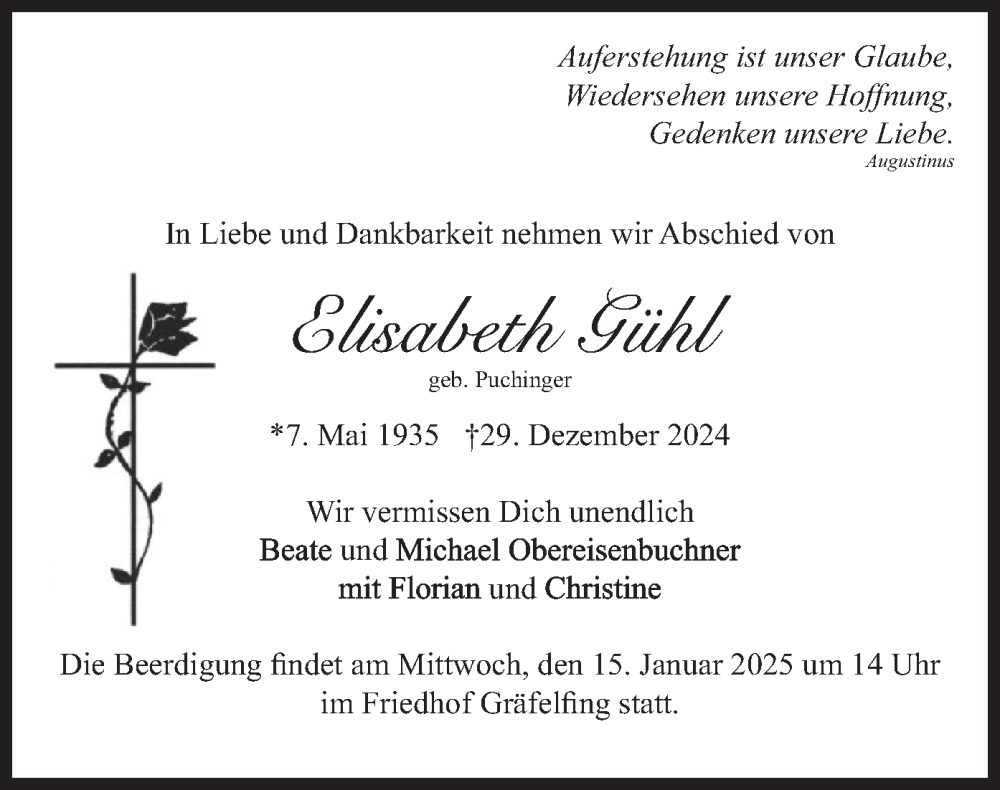 Hier finden Sie alle Traueranzeigen aus der Zeitung, die bisher für Elisabeth Gühl erschienen sind. Weitere Traueranzeigen, die in der Zeitung erscheinen, werden hier ebenfalls aufgelistet