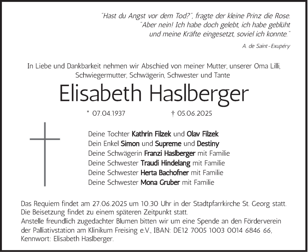 Hier finden Sie alle Traueranzeigen aus der Zeitung, die bisher für Elisabeth Haslberger erschienen sind. Weitere Traueranzeigen, die in der Zeitung erscheinen, werden hier ebenfalls aufgelistet