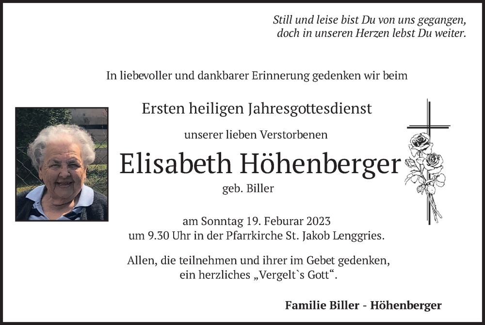 Hier finden Sie alle Traueranzeigen aus der Zeitung, die bisher für Elisabeth Höhenberger erschienen sind. Weitere Traueranzeigen, die in der Zeitung erscheinen, werden hier ebenfalls aufgelistet