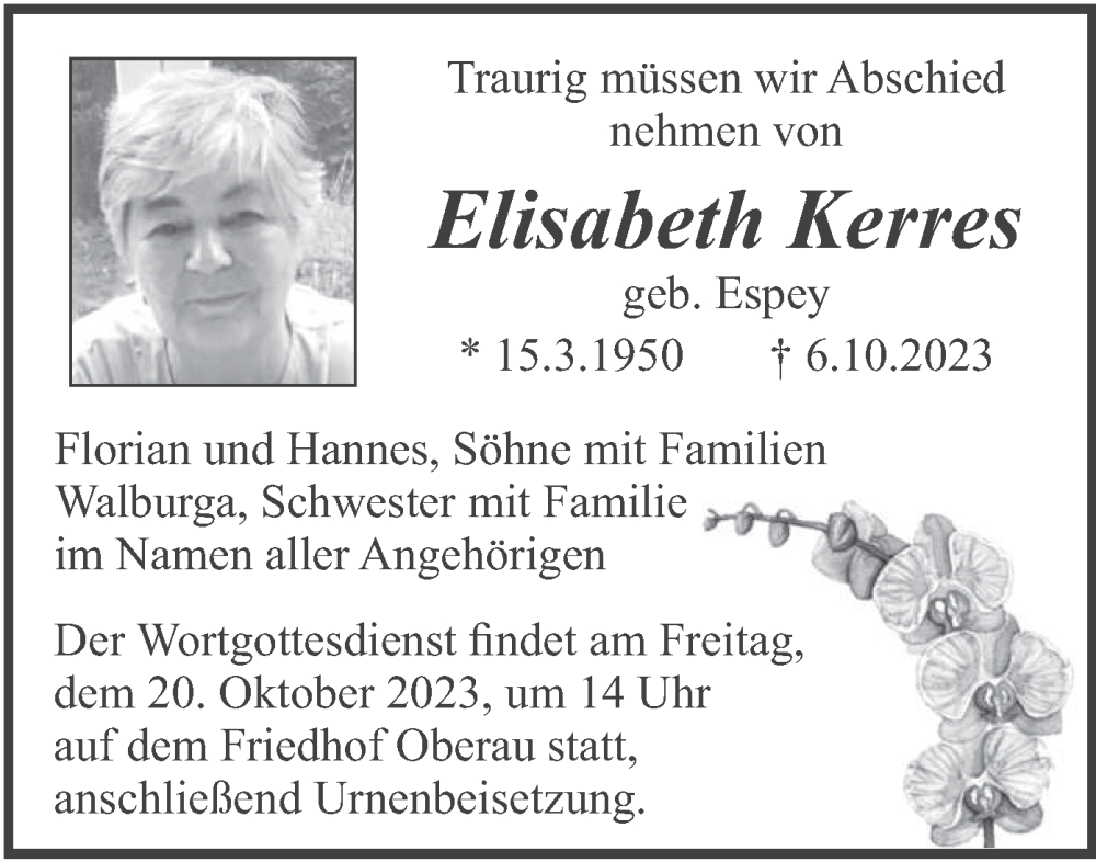 Hier finden Sie alle Traueranzeigen aus der Zeitung, die bisher für Elisabeth Kerres erschienen sind. Weitere Traueranzeigen, die in der Zeitung erscheinen, werden hier ebenfalls aufgelistet