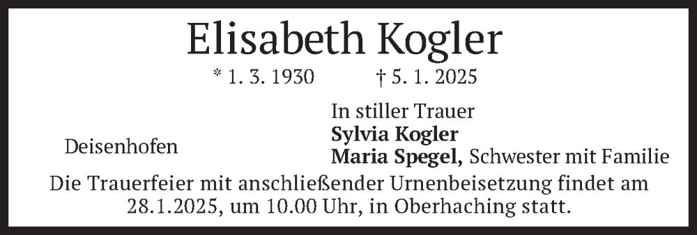 Hier finden Sie alle Traueranzeigen aus der Zeitung, die bisher für Elisabeth Kogler erschienen sind. Weitere Traueranzeigen, die in der Zeitung erscheinen, werden hier ebenfalls aufgelistet
