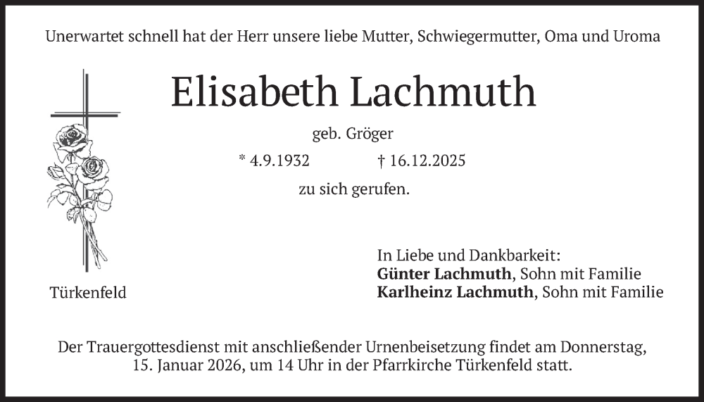Hier finden Sie alle Traueranzeigen aus der Zeitung, die bisher für Elisabeth Lachmuth erschienen sind. Weitere Traueranzeigen, die in der Zeitung erscheinen, werden hier ebenfalls aufgelistet