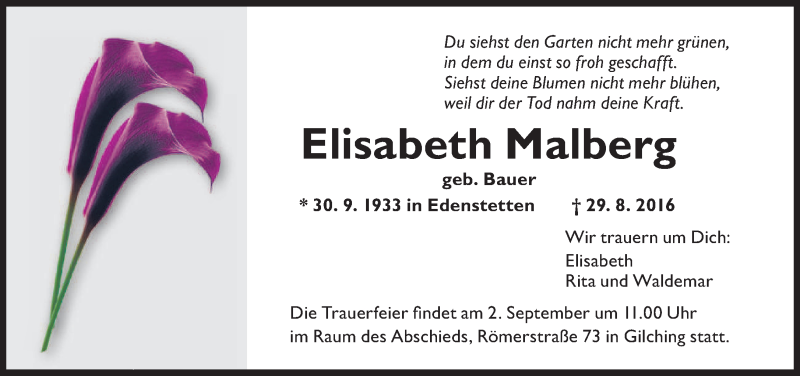Hier finden Sie alle Traueranzeigen aus der Zeitung, die bisher für Elisabeth Malberg erschienen sind. Weitere Traueranzeigen, die in der Zeitung erscheinen, werden hier ebenfalls aufgelistet