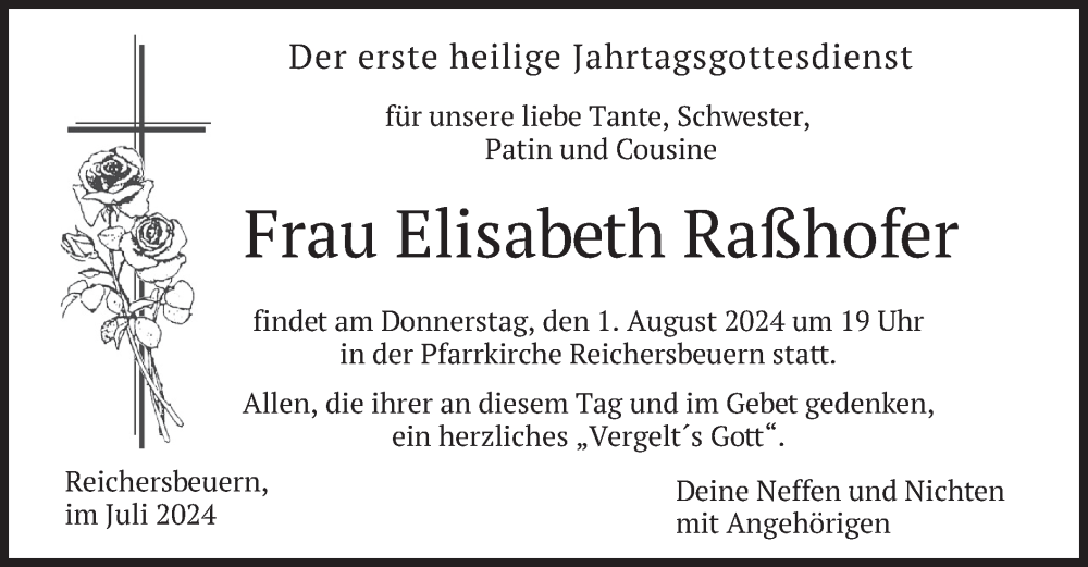 Hier finden Sie alle Traueranzeigen aus der Zeitung, die bisher für Elisabeth Raßhofer erschienen sind. Weitere Traueranzeigen, die in der Zeitung erscheinen, werden hier ebenfalls aufgelistet