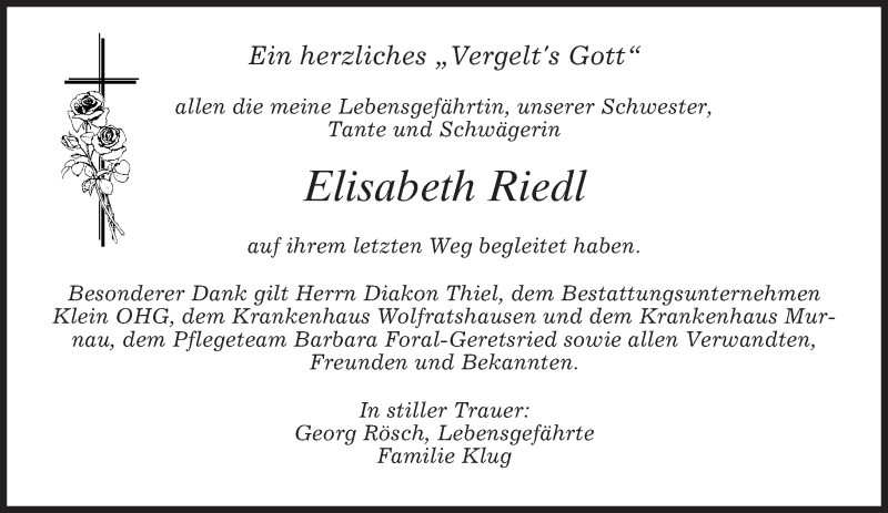 Hier finden Sie alle Traueranzeigen aus der Zeitung, die bisher für Elisabeth Riedl erschienen sind. Weitere Traueranzeigen, die in der Zeitung erscheinen, werden hier ebenfalls aufgelistet