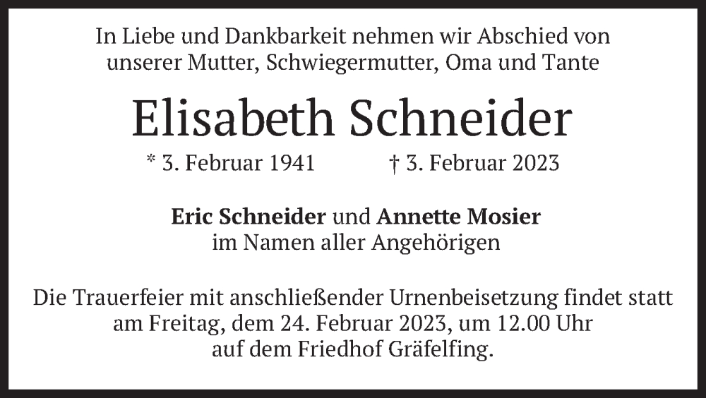 Hier finden Sie alle Traueranzeigen aus der Zeitung, die bisher für Elisabeth Schneider erschienen sind. Weitere Traueranzeigen, die in der Zeitung erscheinen, werden hier ebenfalls aufgelistet