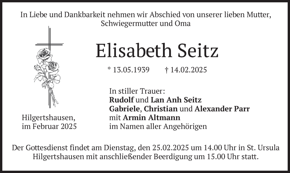 Hier finden Sie alle Traueranzeigen aus der Zeitung, die bisher für Elisabeth Seitz erschienen sind. Weitere Traueranzeigen, die in der Zeitung erscheinen, werden hier ebenfalls aufgelistet