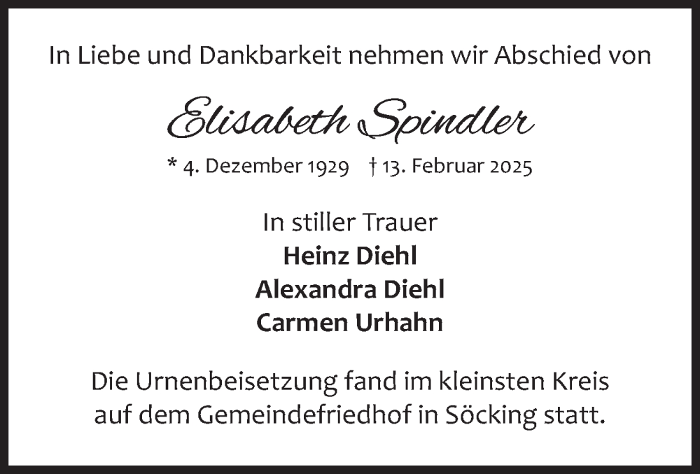 Hier finden Sie alle Traueranzeigen aus der Zeitung, die bisher für Elisabeth Spindler erschienen sind. Weitere Traueranzeigen, die in der Zeitung erscheinen, werden hier ebenfalls aufgelistet