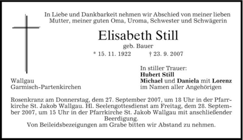 Hier finden Sie alle Traueranzeigen aus der Zeitung, die bisher für Elisabeth Still erschienen sind. Weitere Traueranzeigen, die in der Zeitung erscheinen, werden hier ebenfalls aufgelistet
