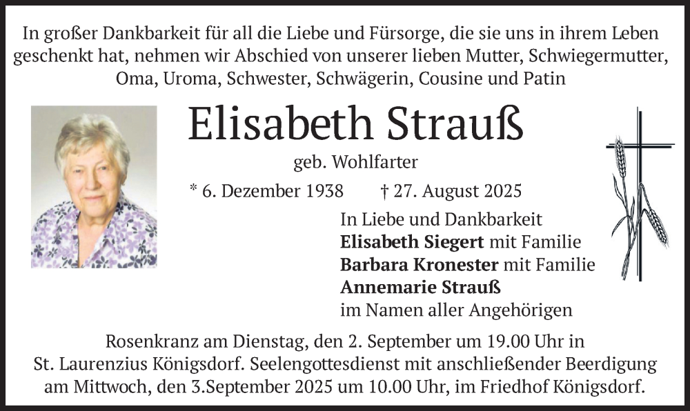 Hier finden Sie alle Traueranzeigen aus der Zeitung, die bisher für Elisabeth Strauß erschienen sind. Weitere Traueranzeigen, die in der Zeitung erscheinen, werden hier ebenfalls aufgelistet