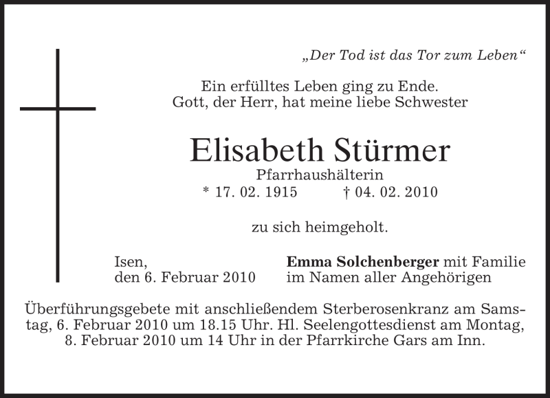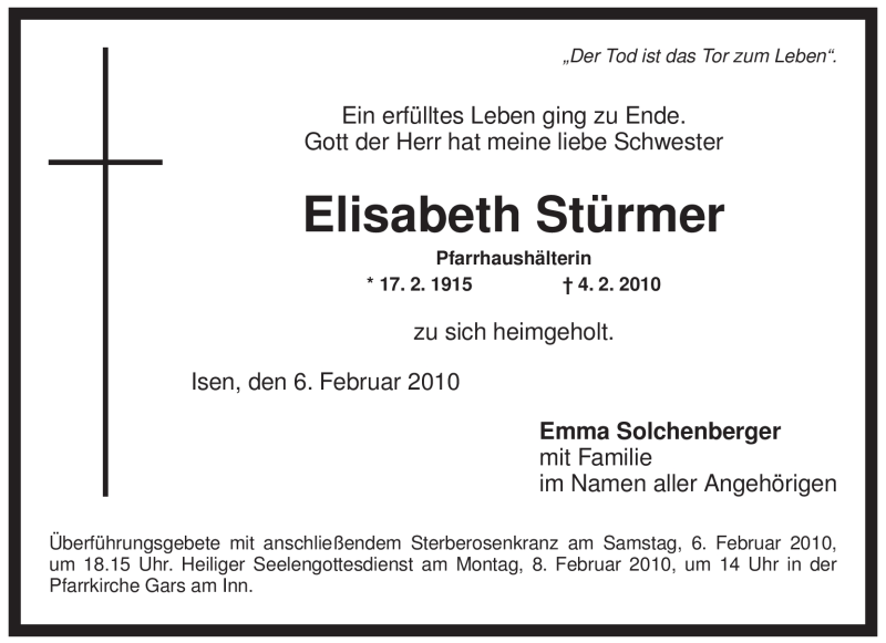 Hier finden Sie alle Traueranzeigen aus der Zeitung, die bisher für Elisabeth Stürmer erschienen sind. Weitere Traueranzeigen, die in der Zeitung erscheinen, werden hier ebenfalls aufgelistet