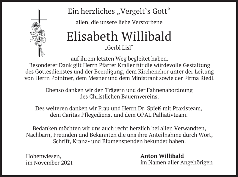 Hier finden Sie alle Traueranzeigen aus der Zeitung, die bisher für Elisabeth Willibald erschienen sind. Weitere Traueranzeigen, die in der Zeitung erscheinen, werden hier ebenfalls aufgelistet