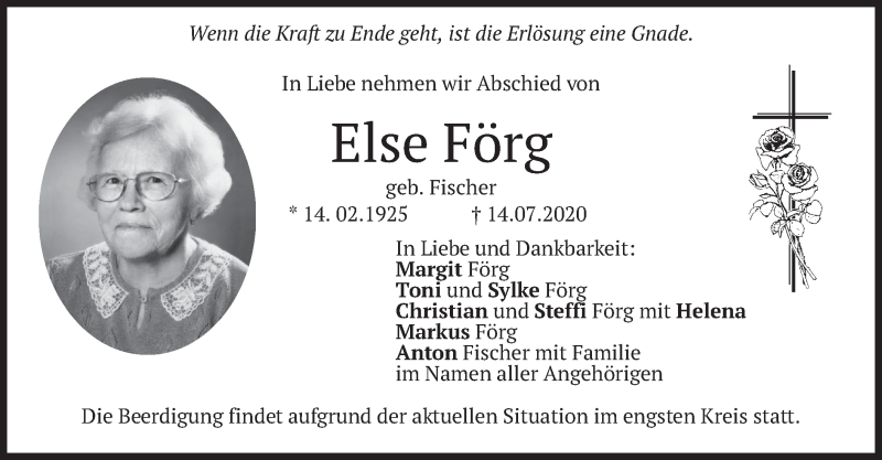 Hier finden Sie alle Traueranzeigen aus der Zeitung, die bisher für Else Förg erschienen sind. Weitere Traueranzeigen, die in der Zeitung erscheinen, werden hier ebenfalls aufgelistet