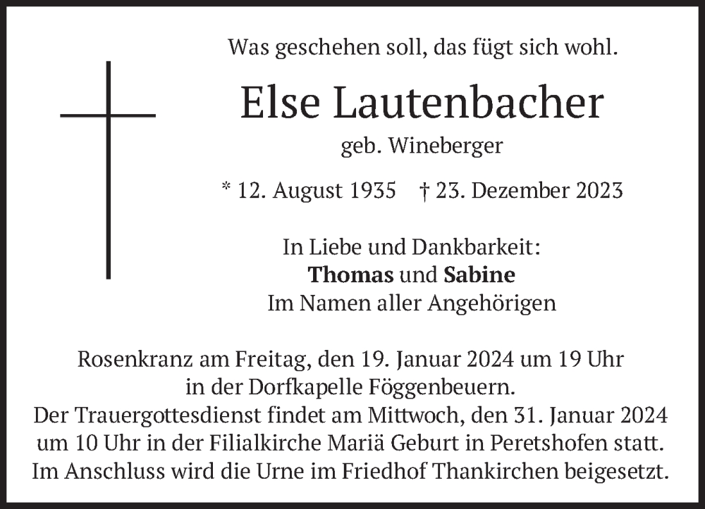 Hier finden Sie alle Traueranzeigen aus der Zeitung, die bisher für Else Lautenbacher erschienen sind. Weitere Traueranzeigen, die in der Zeitung erscheinen, werden hier ebenfalls aufgelistet