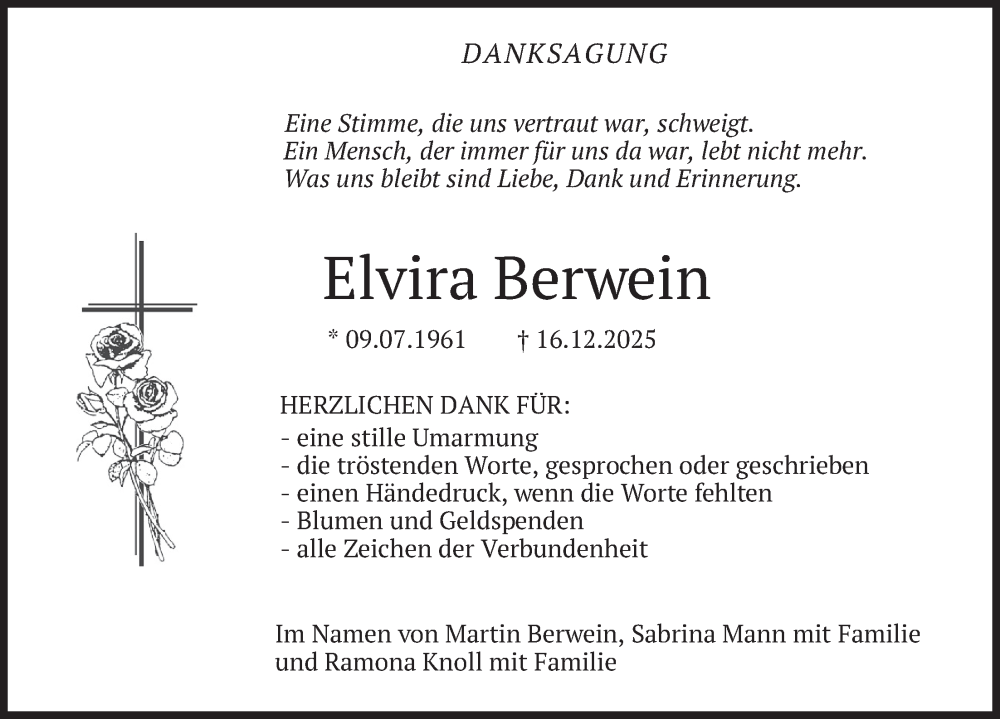 Hier finden Sie alle Traueranzeigen aus der Zeitung, die bisher für Elvira Berwein erschienen sind. Weitere Traueranzeigen, die in der Zeitung erscheinen, werden hier ebenfalls aufgelistet
