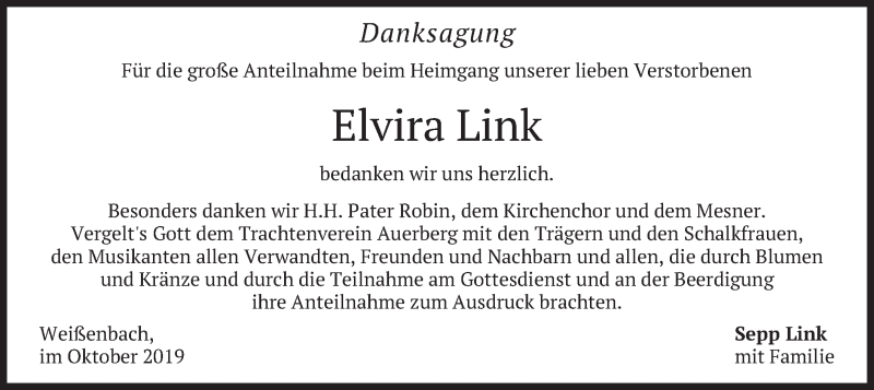 Hier finden Sie alle Traueranzeigen aus der Zeitung, die bisher für Elvira Link erschienen sind. Weitere Traueranzeigen, die in der Zeitung erscheinen, werden hier ebenfalls aufgelistet