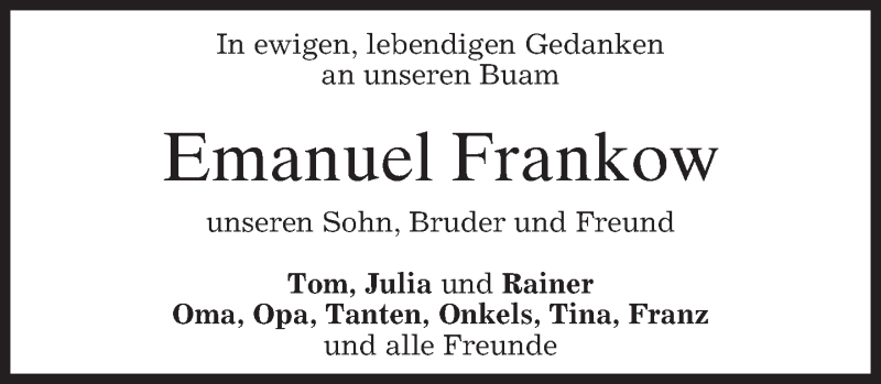 Hier finden Sie alle Traueranzeigen aus der Zeitung, die bisher für Emanuel Frankow erschienen sind. Weitere Traueranzeigen, die in der Zeitung erscheinen, werden hier ebenfalls aufgelistet