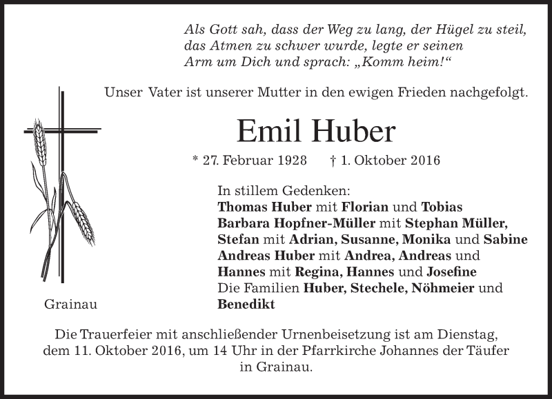 Hier finden Sie alle Traueranzeigen aus der Zeitung, die bisher für Emil Huber erschienen sind. Weitere Traueranzeigen, die in der Zeitung erscheinen, werden hier ebenfalls aufgelistet