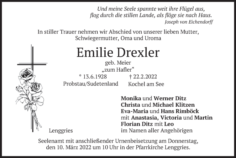 Hier finden Sie alle Traueranzeigen aus der Zeitung, die bisher für Emilie Drexler erschienen sind. Weitere Traueranzeigen, die in der Zeitung erscheinen, werden hier ebenfalls aufgelistet