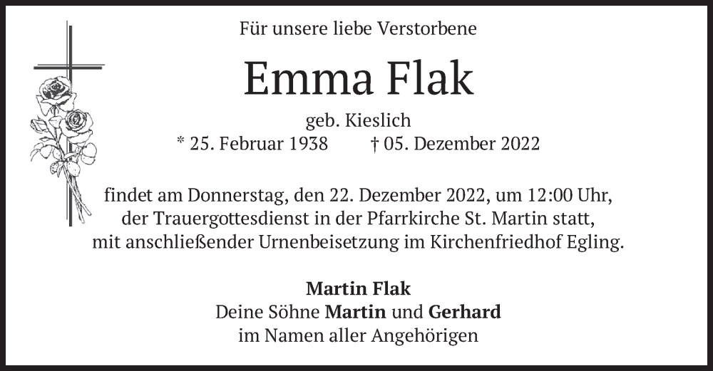 Hier finden Sie alle Traueranzeigen aus der Zeitung, die bisher für Emma Flak erschienen sind. Weitere Traueranzeigen, die in der Zeitung erscheinen, werden hier ebenfalls aufgelistet