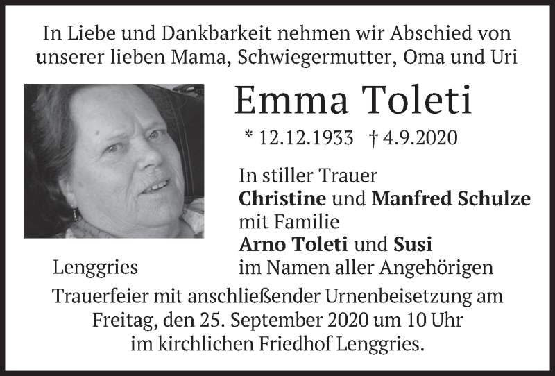 Hier finden Sie alle Traueranzeigen aus der Zeitung, die bisher für Emma Toleti erschienen sind. Weitere Traueranzeigen, die in der Zeitung erscheinen, werden hier ebenfalls aufgelistet
