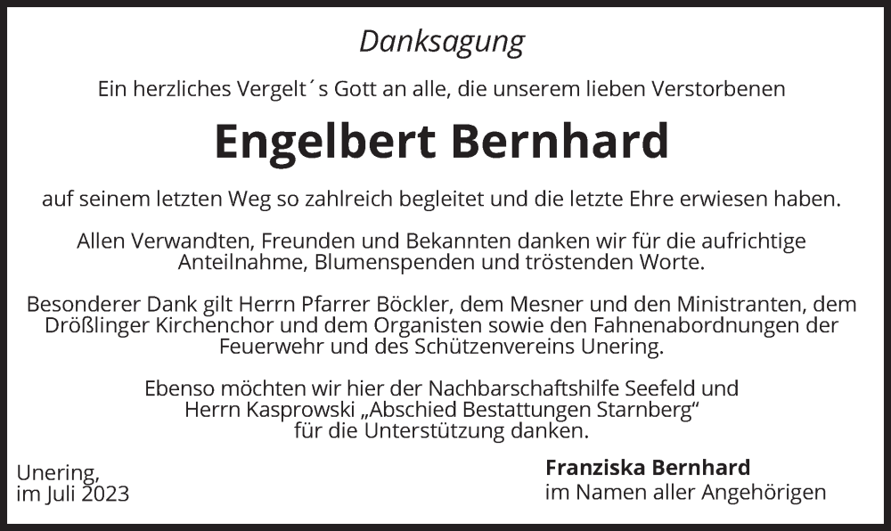 Hier finden Sie alle Traueranzeigen aus der Zeitung, die bisher für Engelbert Bernhard erschienen sind. Weitere Traueranzeigen, die in der Zeitung erscheinen, werden hier ebenfalls aufgelistet
