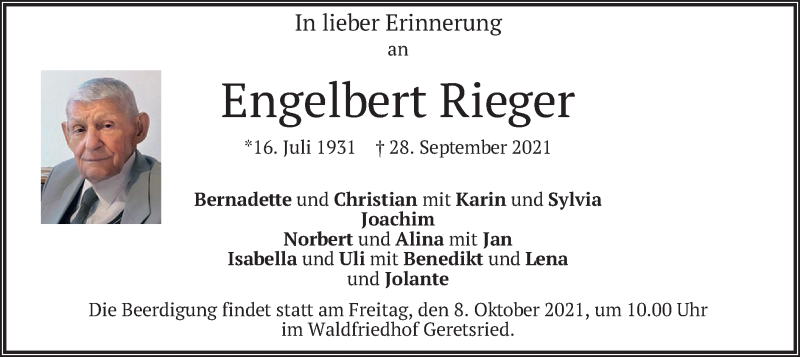 Hier finden Sie alle Traueranzeigen aus der Zeitung, die bisher für Engelbert Rieger erschienen sind. Weitere Traueranzeigen, die in der Zeitung erscheinen, werden hier ebenfalls aufgelistet