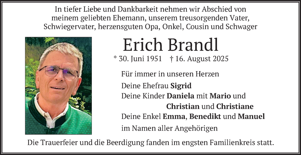 Hier finden Sie alle Traueranzeigen aus der Zeitung, die bisher für Erich Brandl erschienen sind. Weitere Traueranzeigen, die in der Zeitung erscheinen, werden hier ebenfalls aufgelistet