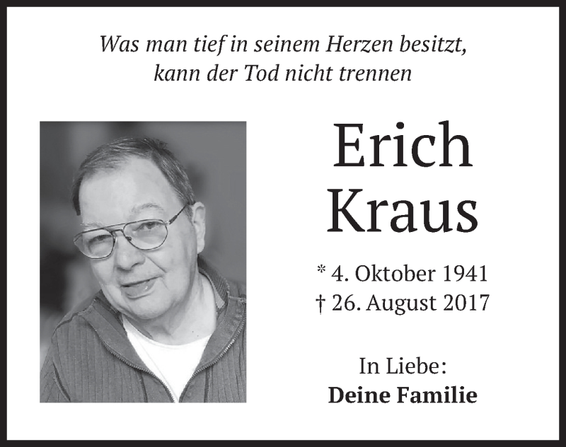 Hier finden Sie alle Traueranzeigen aus der Zeitung, die bisher für Erich Kraus erschienen sind. Weitere Traueranzeigen, die in der Zeitung erscheinen, werden hier ebenfalls aufgelistet