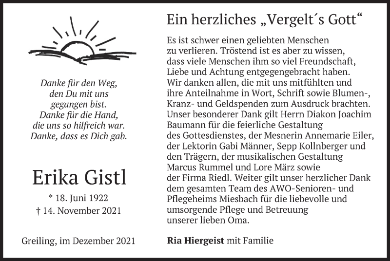 Hier finden Sie alle Traueranzeigen aus der Zeitung, die bisher für Erika Gistl erschienen sind. Weitere Traueranzeigen, die in der Zeitung erscheinen, werden hier ebenfalls aufgelistet