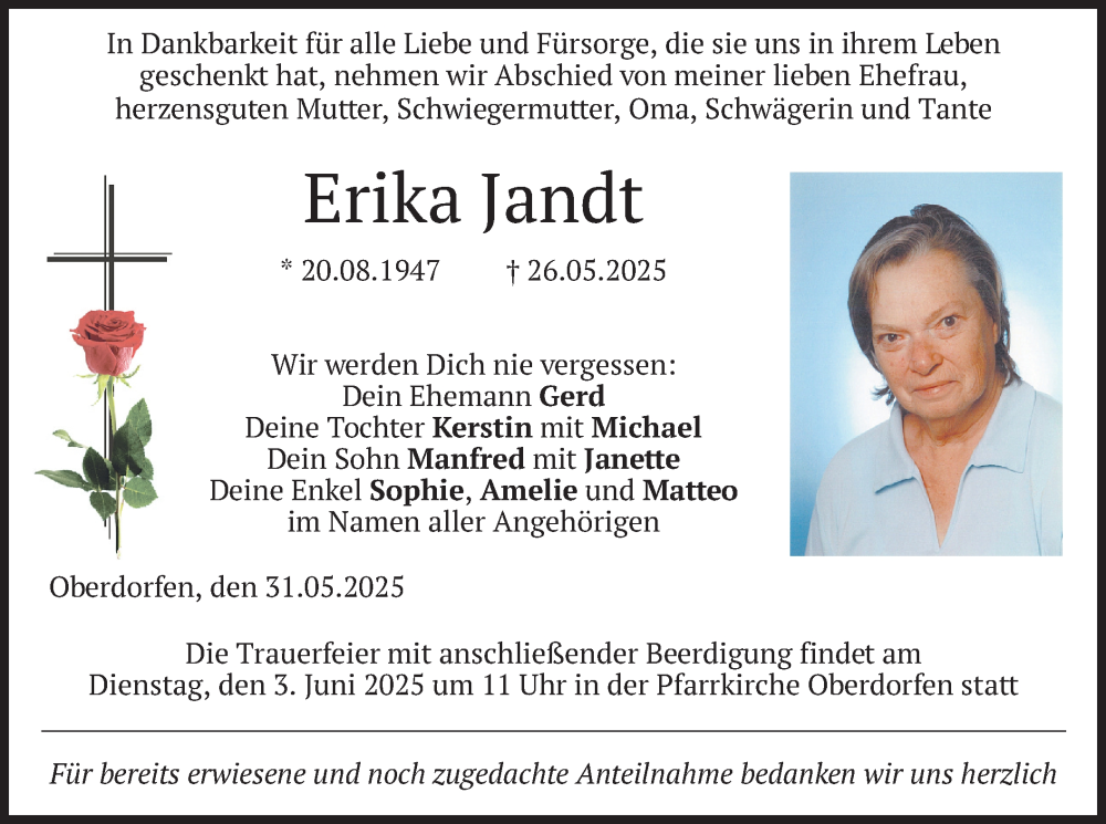 Hier finden Sie alle Traueranzeigen aus der Zeitung, die bisher für Erika Jandt erschienen sind. Weitere Traueranzeigen, die in der Zeitung erscheinen, werden hier ebenfalls aufgelistet